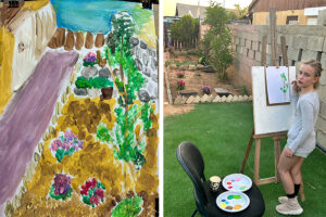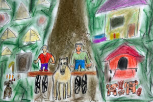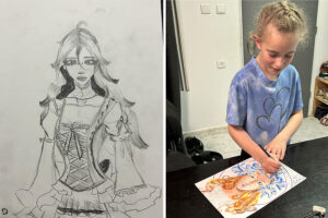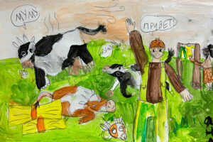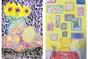 После 10-минутного перерыва с водой и печеньками пробуем рисовать то, что изучили, придумываем новые сюжеты и истории и воплощаем эти фантазии на бумаге в разных техниках, а также создаем красочные аппликации и совместные инсталляции на разные темы, ходим на пленеры.